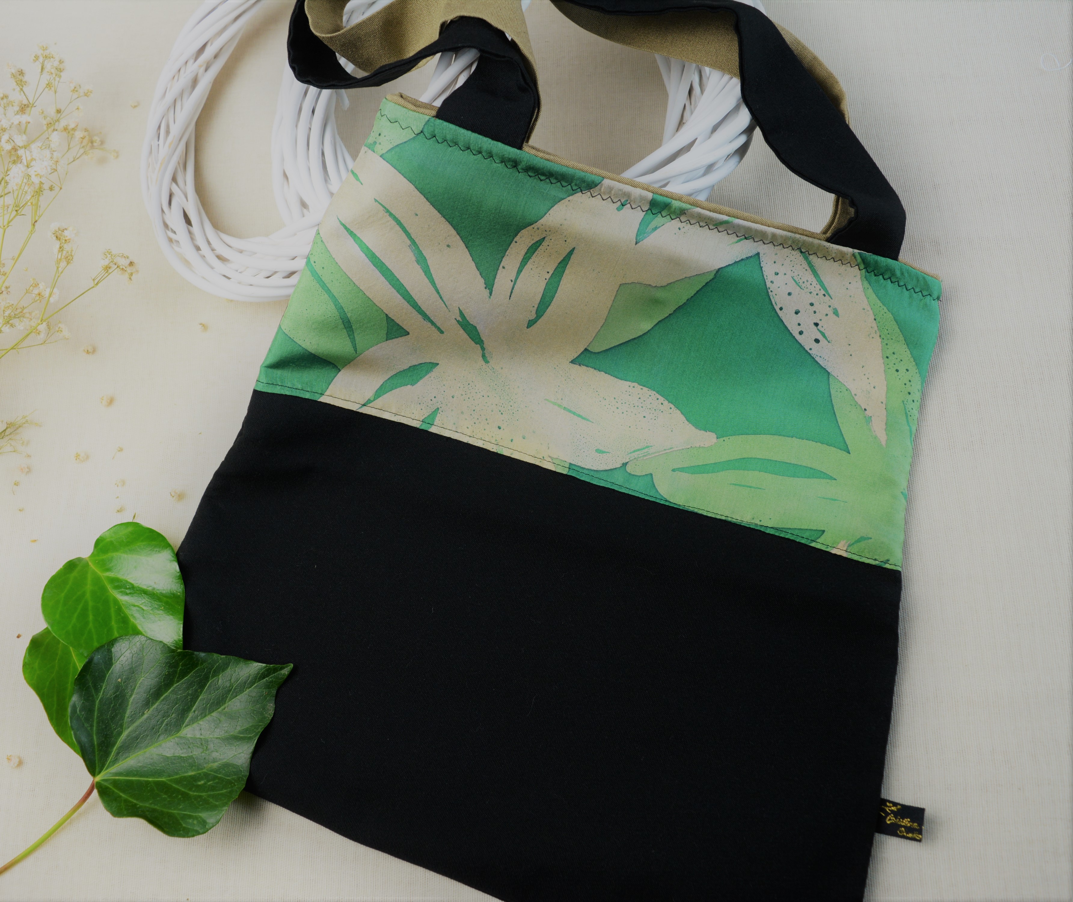 Bolso de tela y seda pintada a mano con cierre de cremallera.